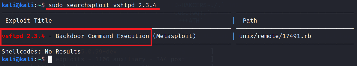 vsftpd 2.3.4 취약점을 검색하기 위해 다음 명령을 사용한다.