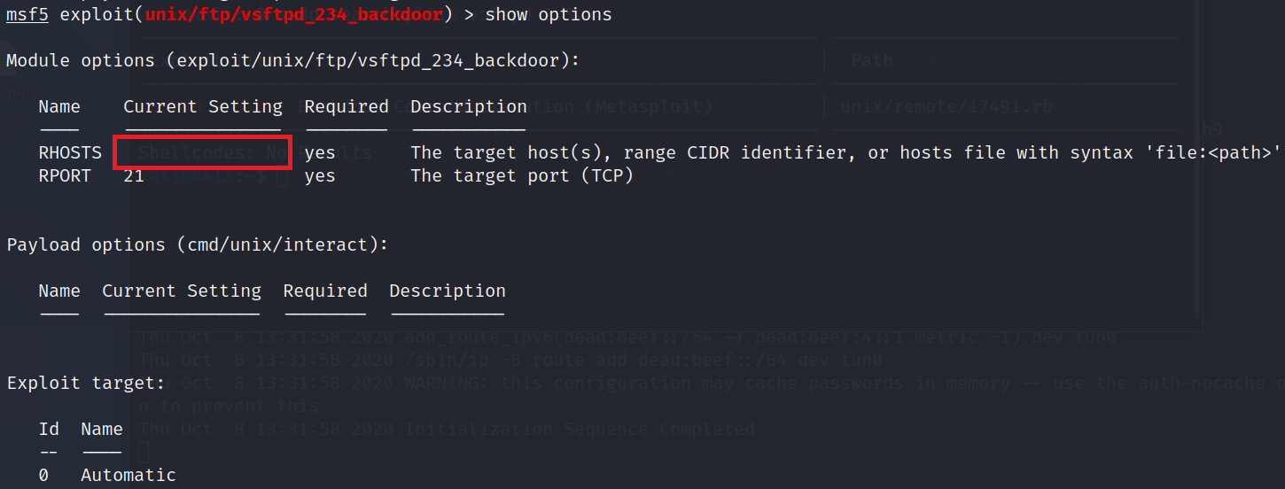 아직 원격 호스트(RHOSTS)가 설정되지 않았음을 알 수 있다.