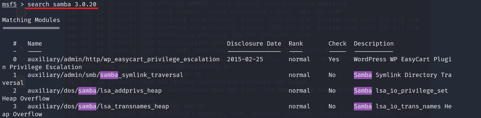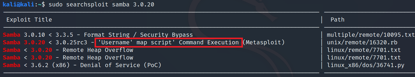 아래 명령을 통해 samba 3.0.20 취약점을 검색한다.