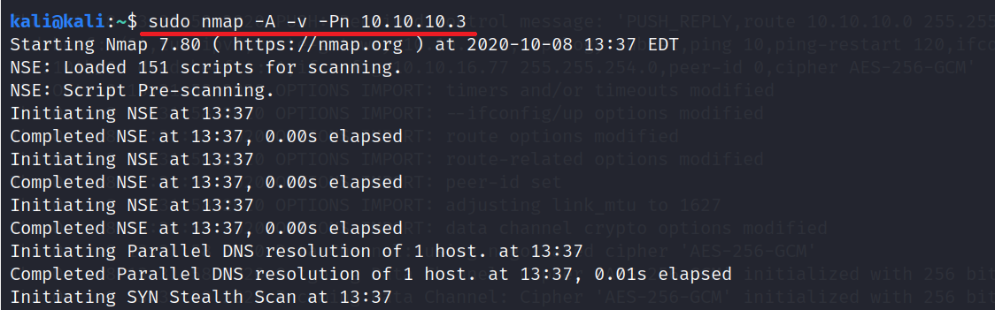 | sudo nmap -A -v -Pn 10.10.10.3 |