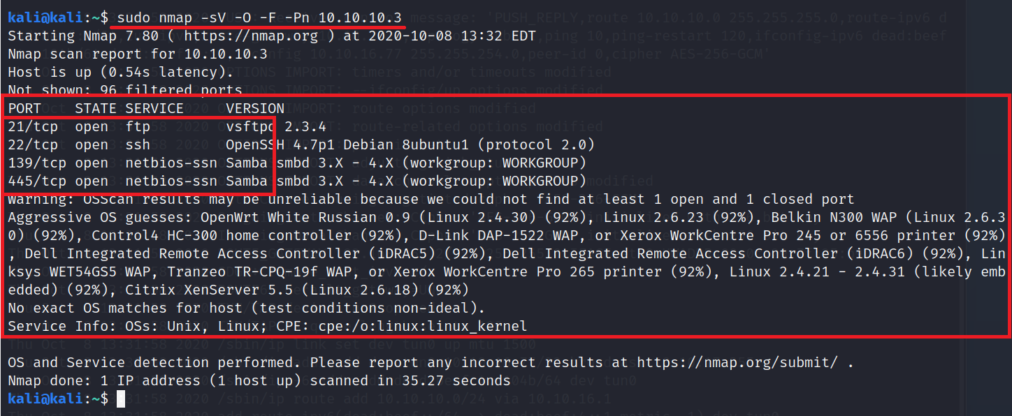 | sudo nmap -sV -O -F -Pn 10.10.10.3 |