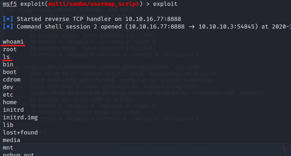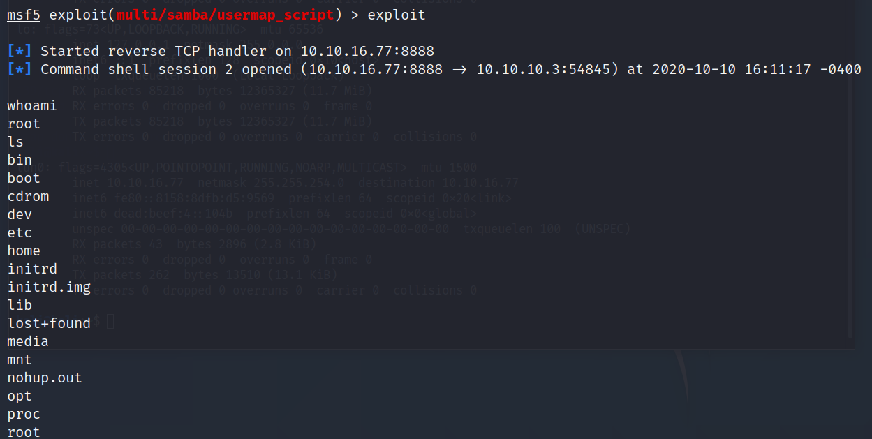 exploit/multi/samba/usermap_script 공격을 사용하고