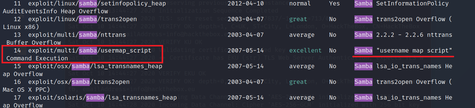 14번째에 samba "username map script 취약점 공격이 있는 것을 확인했다.