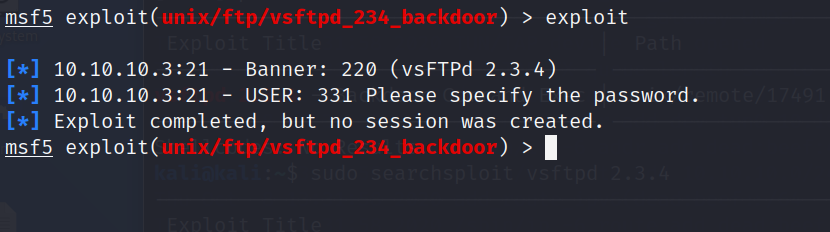 searchsploit을 사용하여 vsftpd 2.3.4 알려진 취약점이 있는지 확인한다.