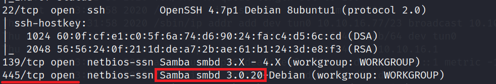 445포트가 열려있는 것을 보고 해당 포트에서 사용하고 있는 Samba 3.0.20 버전에 취약점이 있는지 알아보려한다.