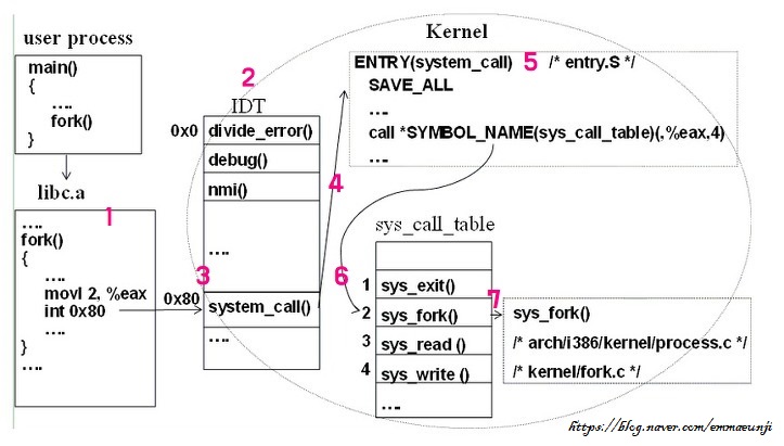 ② 어셈블리로 소프트웨어 인터럽트를(0x80)를 발생시켜야 시스템 호출이 발생하는데, wrapper함수가 이를 대신한다