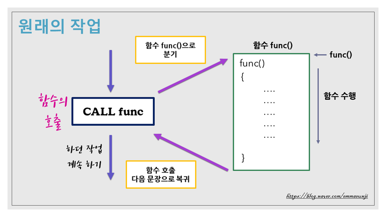 반복되는 특정 기능을 모아서 이름을 붙인 기능은 매크로와 같지만, 프로그램의 흐름이 메인 루틴에 있지 않고 별도의 공간에 한번만 생긴 것이 다르다