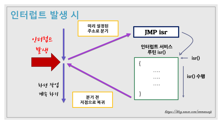 인터럽트 발생 시 ISR (인터럽트 서비스 루틴)이라는 특수 서브 루틴으로 전송