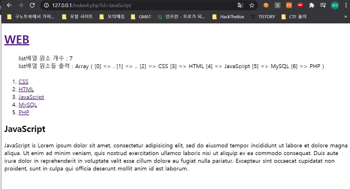 <!DOCTYPE html> <html> <head> <meta charset="utf-8"> <title></title> </head> <body> <h1><a href="index3.php">WEB</a></h1> <ol> <li><a href="index3.php?id=HTML">HTML</a></li> <!-- 해당 하이퍼링크를 클릭하면 id 파라미터 값(여기선 HTML)을 전달한다. 즉, 클릭하면 id 값으로 HTML이 들어간다.--> <li><a href="index3.php?id=CSS">CSS</a></li> <!-- 해당 하이퍼링크를 클릭하면 id 파라미터 값(여기선 CSS)을 전달한다. --> <li><a href="index3.php?id=JavaScript">JavaScript</a></li> <!-- 해당 하이퍼링크를 클릭하면 id 파라미터 값(여기선 JavaScript)을 전달한다. --> </ol> <h2> <?php if(isset($_GET['id'])){ /* isset() 함수 : 해당 변수가 선언되었는지 확인하고 그렇다면 True, 아니면 False를 출력. 즉 if ()안에 true, false 값을 주게된다. 즉, isset() 함수 괄호안에 변수로 GET방식으로 id 파라미터값을 받아오려하는데 이 id 파라미터값이 존재하는지 확인하는 조건문이다. */ echo $_GET['id']; // id 파라미터값이 존재한다면 해당 id 파라미터값 출력. } else { // 존재하지 않는다면 else {}안 입력값 실행.(else { }안에 입력한 값 출력.) echo "HTML, CSS, JavaScript 중 하나를 선택해주세요.(id 파라미터값 입력 안됨)"; } ?> </h2>