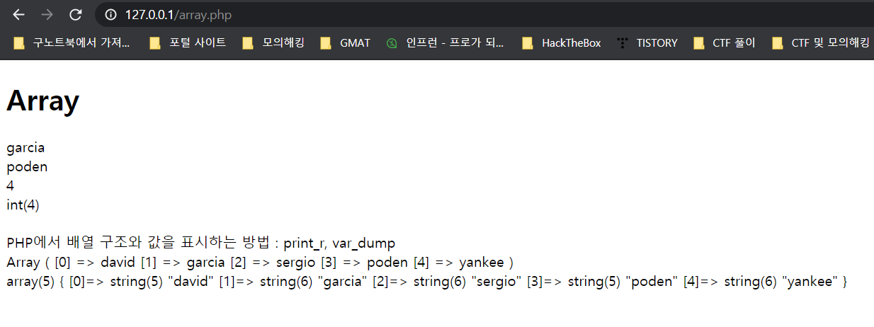 echo $friends[1]; /* 배열의 원소값 출력. garcia가 출력된다. friends라는 이름의 배열의 2번째에 있는 원소값 출력. 순서는 0부터 시작한다. */ echo '<br>'; // html의 <br> 태그를 사용할땐 echo와 ' '를 사용해야 되나봄. echo $friends[3]; // friends라는 이름의 배열의 4번째에 있는 원소값 출력. echo '<br>';