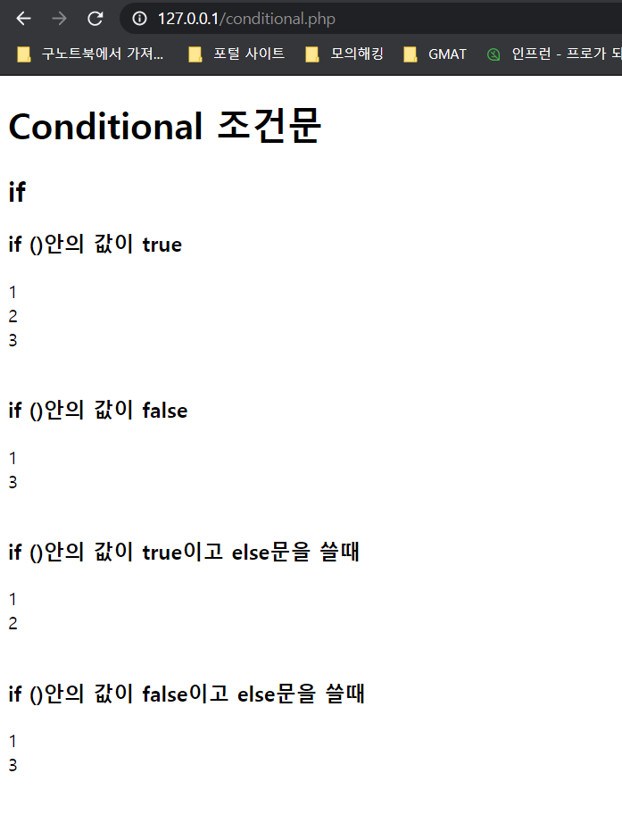 <!DOCTYPE html> <html> <head> <meta charset="utf-8"> </head> <body> <h1>Conditional 조건문</h1> <h2>if</h2> <h3>if ()안의 값이 true</h3> <?php echo '1<br>'; if(true){ // if 괄호 안의 값이 true라면 {}중괄호 안에 있는 값이 실행. echo '2<br>'; } echo '3<br>'; ?> <br> <h3>if ()안의 값이 false</h3> <?php echo '1<br>'; if(false){ // if 괄호 안의 값이 false라면 {}중괄호 안에 있는 값이 실행 X. echo '2<br>'; } echo '3<br>'; ?> <br> <h3>if ()안의 값이 true이고 else문을 쓸때</h3> <?php echo '1<br>'; if(true){ // if(true) { }괄호 안의 값이 실행되고 else { }괄호 안의 값은 실행 X. echo '2<br>'; } else{ echo '3<br>'; } ?> <br> <h3>if ()안의 값이 false이고 else문을 쓸때</h3> <?php echo '1<br>'; if(false){ // if(true) { }괄호 안의 값이 실행되지않고 else { }괄호 안의 값은 실행된다. echo '2<br>'; } else{ echo '3<br>'; } ?> </body> </html> |