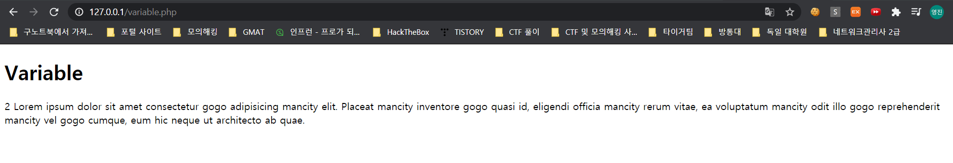 <!DOCTYPE html> <html> <body> <h1>Variable</h1> <?php $a = 1; // 변수 선언. 앞에 $를 붙여줌. echo $a+1; // 변수의 활용. 연산하는데 활용함. ?> <?php // 변수의 활용. 만약, 수많은 텍스트 글자 중 원하는 단어를 찾아 바꾸려한다면, 너무 오랜시간과 수고가 필요할 것이다. 하지만 이때, 변수를 활용해본다면, 하나의 변수를 생성하여 내가 바꾸려하는 단어를 값으로 입력한다. $name = "mancity"; // 그리고 해당 단어들을 모두 해당 변수로 바꿔주고 그 후로는 변수의 값만 변경해주면 모든 내용들이 변경되어 편해질 것이다. // Lorem이란 문자를 입력하고 Enter를 누르면, 임의의 sample text를 생성해줌. echo "Lorem ipsum dolor sit amet consectetur gogo adipisicing ".$name." elit. Placeat ".$name." inventore gogo quasi id, eligendi officia ".$name." rerum vitae, ea voluptatum ".$name." odit illo gogo reprehenderit ".$name." vel gogo cumque, eum hic neque ut architecto abquae." ?> </body> </html> |